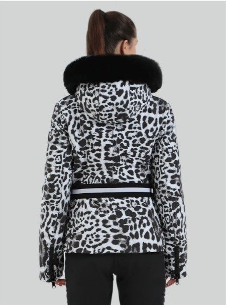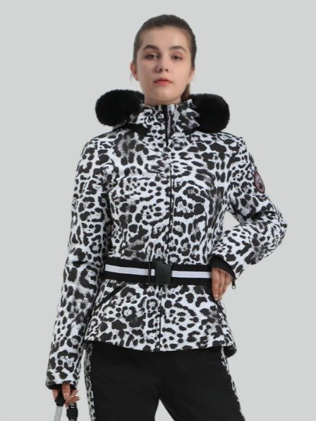 O capuz e a gola são acolchoados com penas de pato macias e quentes, enquanto todo o corpo é forrado com poliéster quente, resistente à água e respirável, tornando-o uma peça essencial para a neve. A camada externa com estampa animal adiciona visibilidade e estilo. Possui ainda um capuz removível com acabamento em pele sintética.